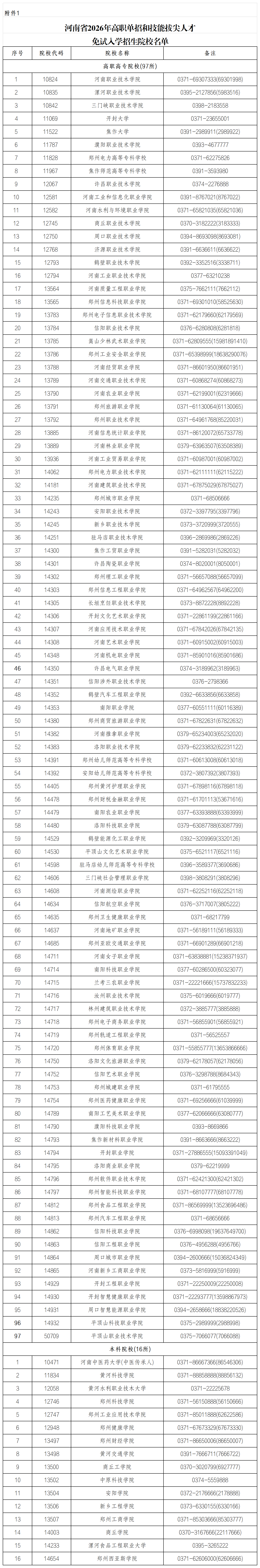 附件1《河南省2026年高职单招和技能拔尖人才免试入学招生院校名单》